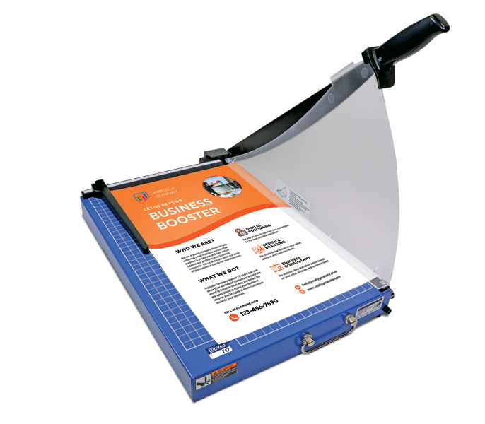 United’s T17 paper trimmer is designed for precision, durability, and portability. Its high-carbon steel blade with an ergonomic handle allows users to accurately trim up to 20 sheets at a time. The full-length safety guard holds the sheets in place while protecting hands from the blade.
